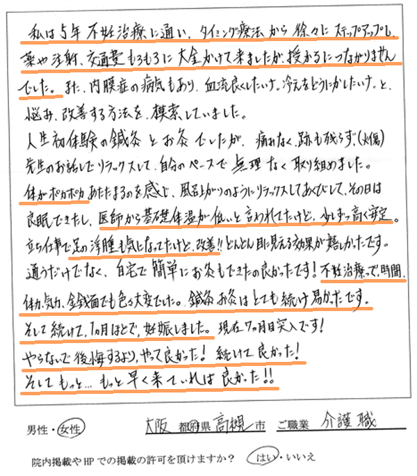 鍼灸治療によって、精神的・肉体的・経済的に楽に妊娠することができ、身体のコンディションを整える事が妊娠への近道だったので思い切って始めてみて良かったです。